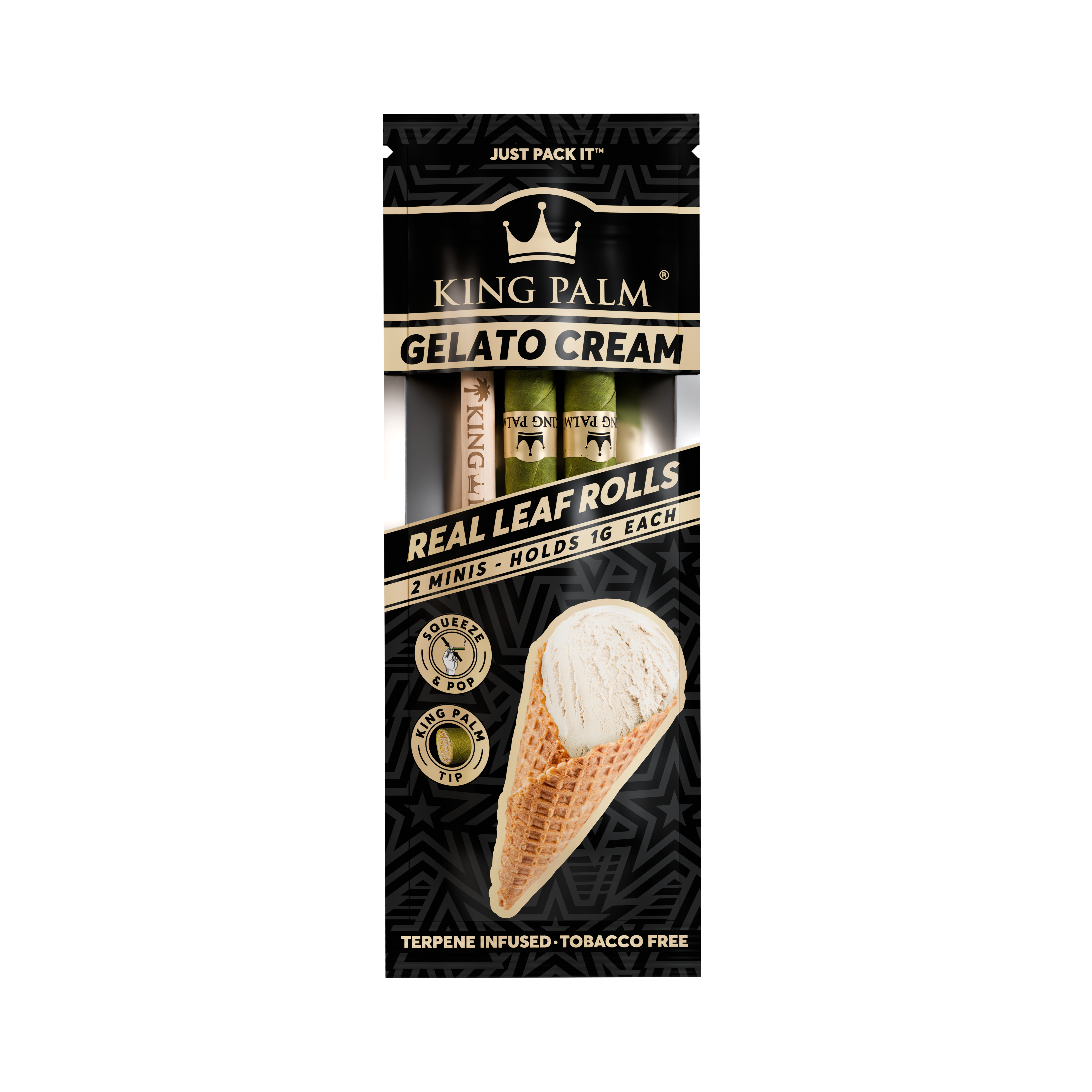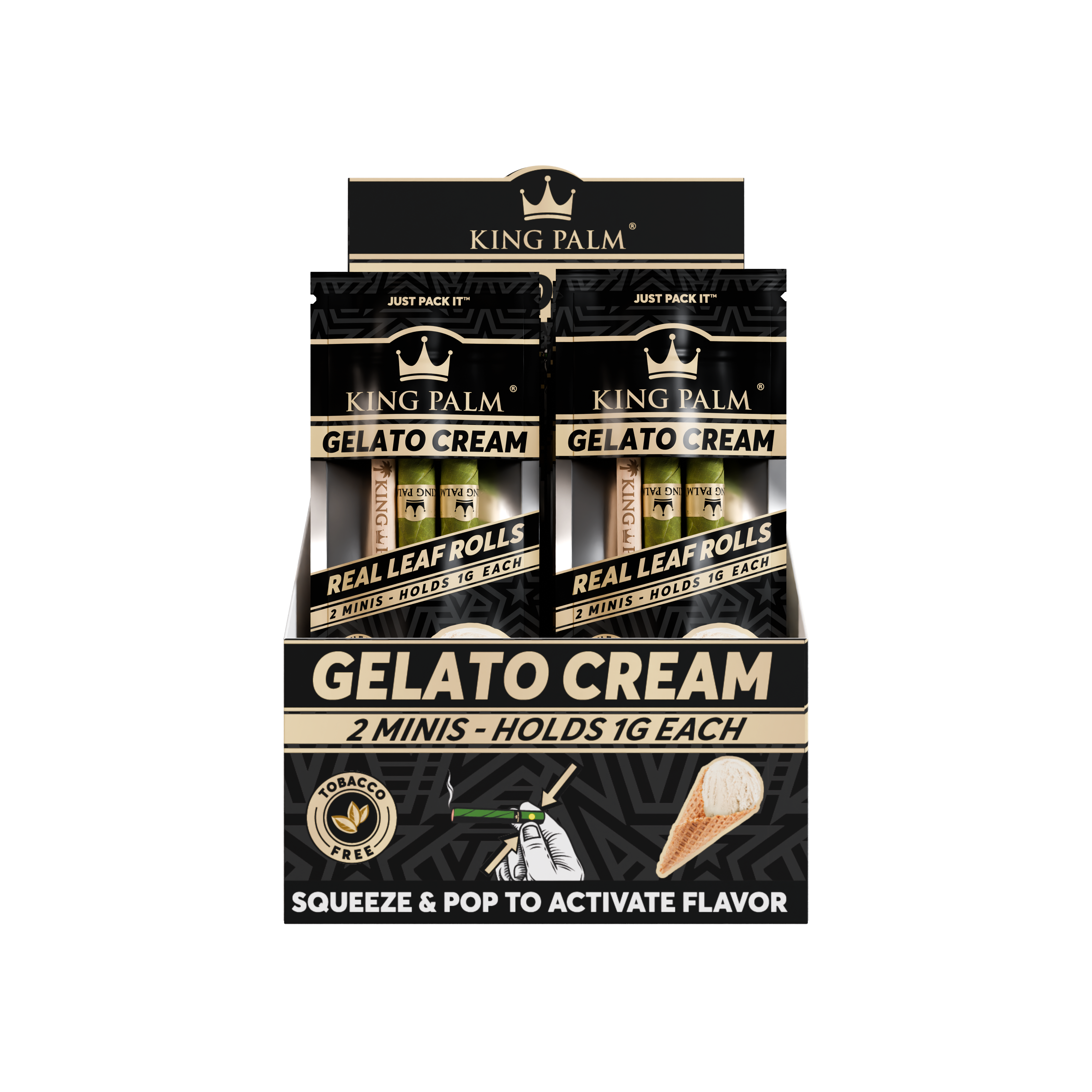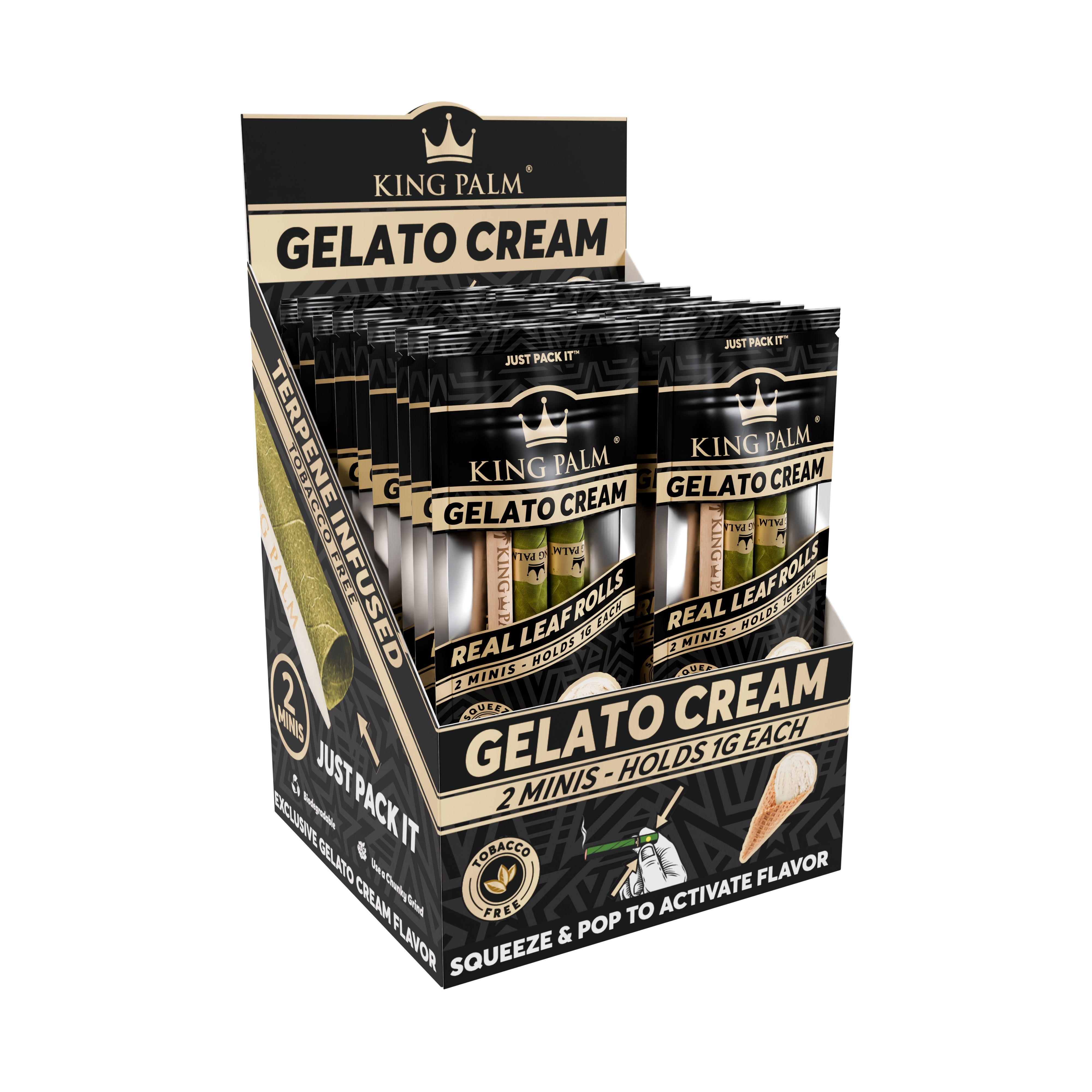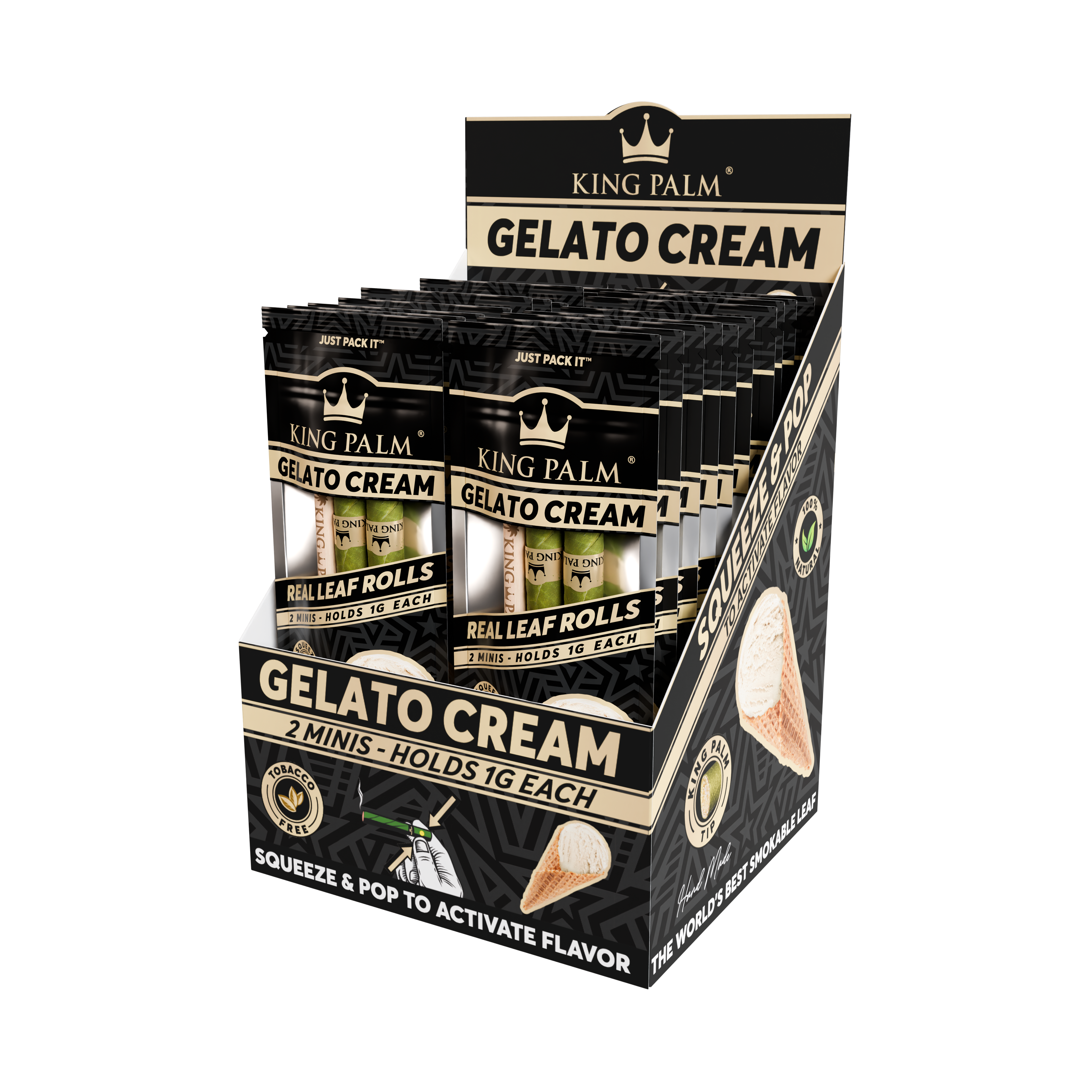 Every display comes with 20 pouches of 2 Gelato Cream Mini Rolls. Set the display box up in your smoke shop to keep a smooth, dessert-inspired pre-roll ready to go. Simply pack the end of your King Palm, pop the filter tip whenever you’re ready, and enjoy the rich, velvety blend of sweet vanilla and creamy gelato.