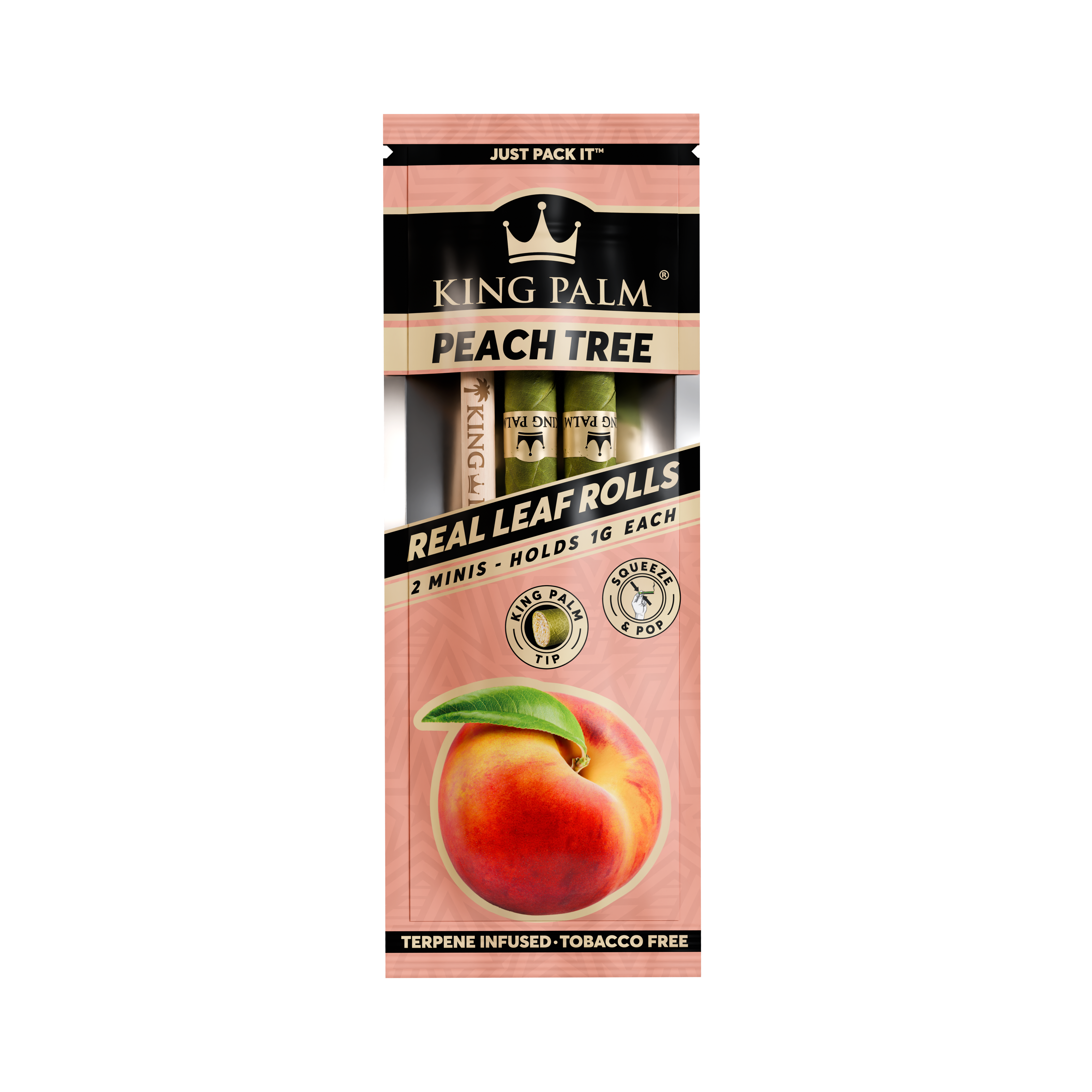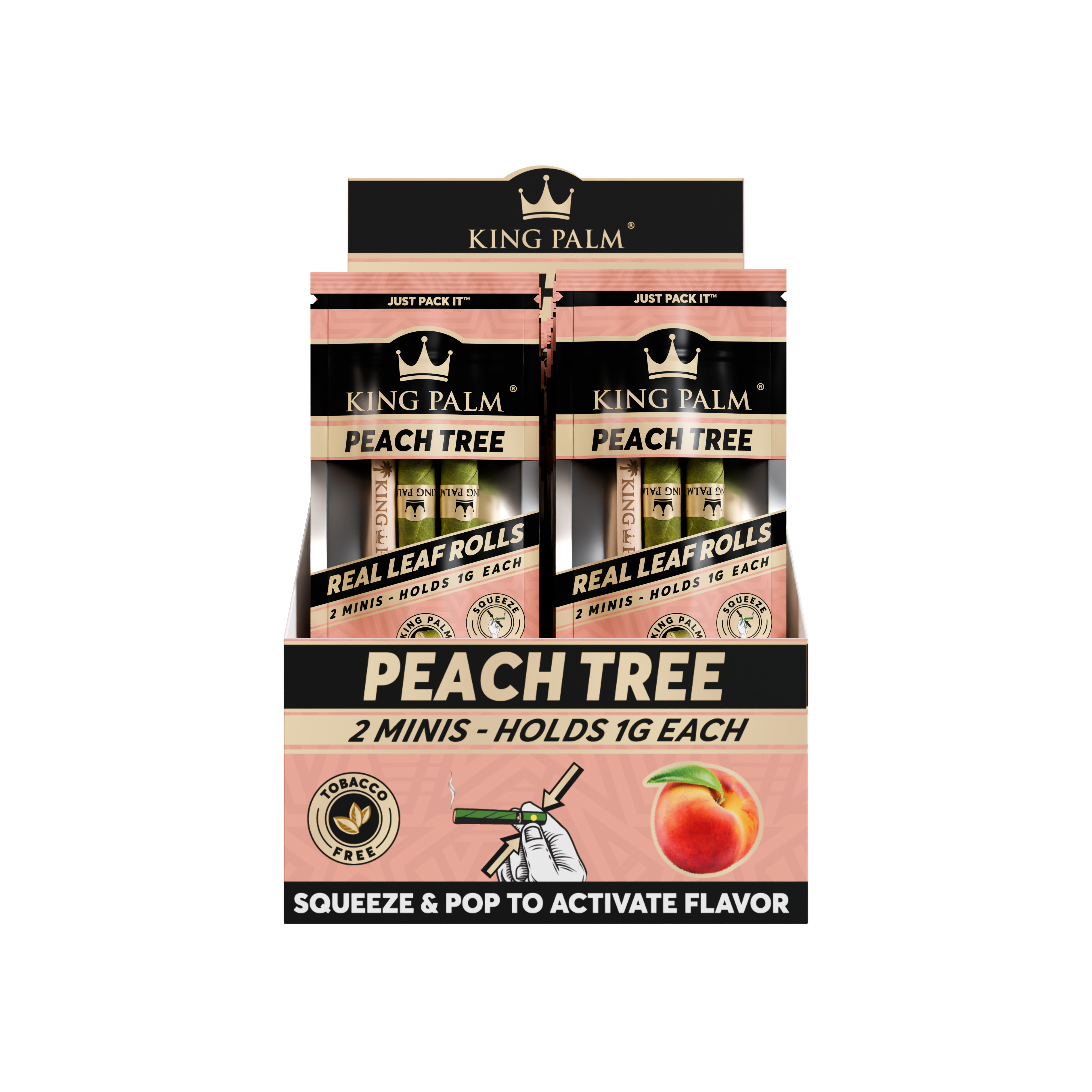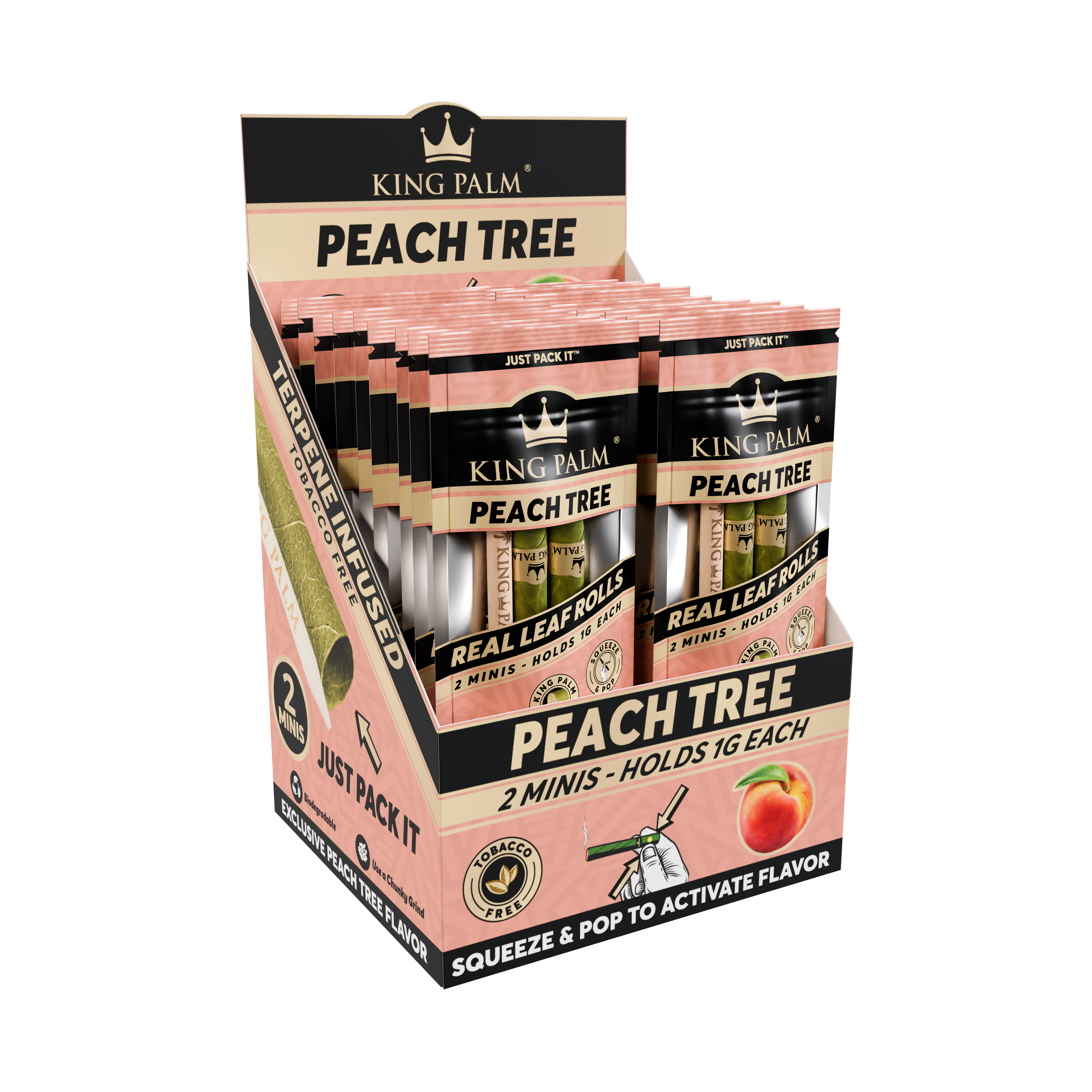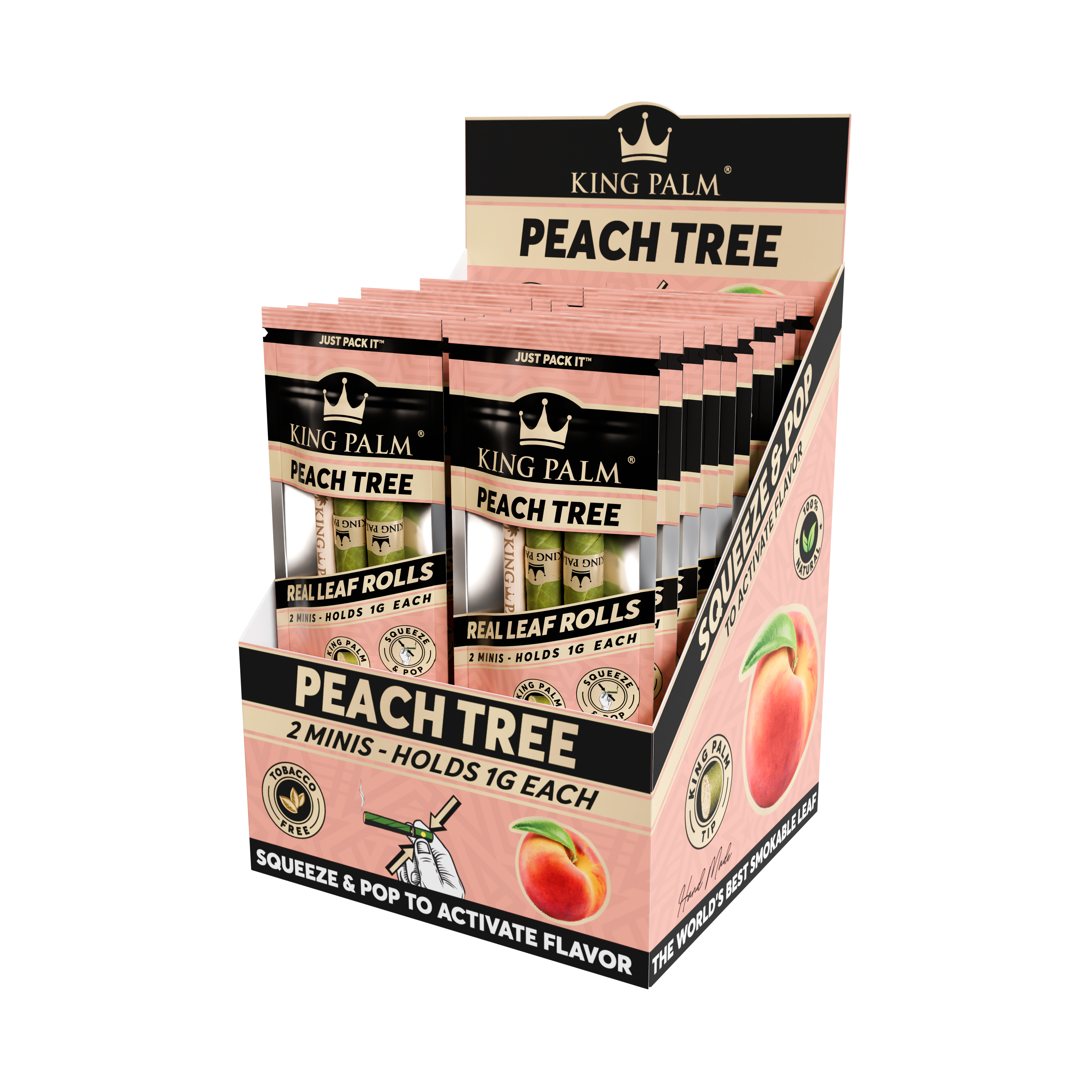 Every display comes with 20 pouches of 2 Peach Tree Mini Rolls. Set the display box up in your smoke shop to keep a refreshing, juicy peach-flavored pre-roll ready to go. Simply pack the end of your King Palm, pop the filter tip whenever you’re ready, and enjoy the smooth, sun-ripened taste of sweet peaches.