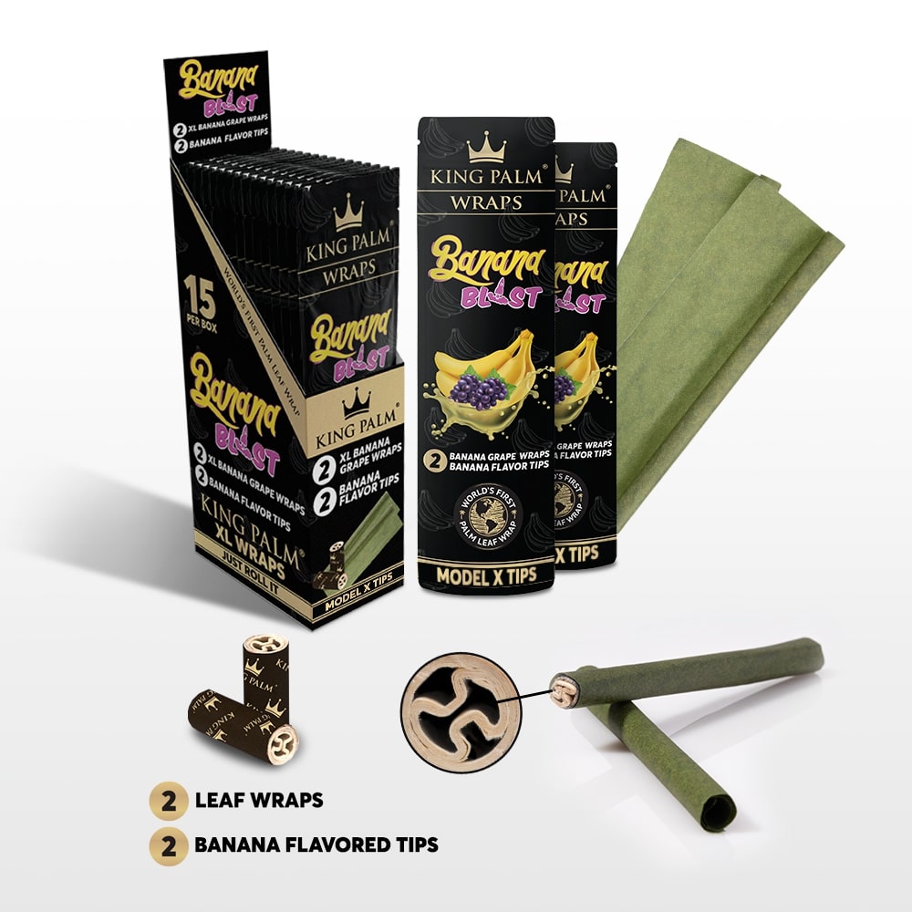 Every pack of King Palm Banana Blasts Wraps comes with two flavored wraps. Unlike our pre-rolled leaf cones, we’ve separated the pieces so you can roll your own product. King Palm wants you to have the option to control how you put your palm together. Roll yours thick, roll it thin; it’s up to you! Plus, you have the option to use your hands or a roller machine. Either way, you’ll want to lay the product in Palm’s flavored wrap, insert the corn husk tip in alignment with the wrap so the edges match up, then roll up nice and tight!