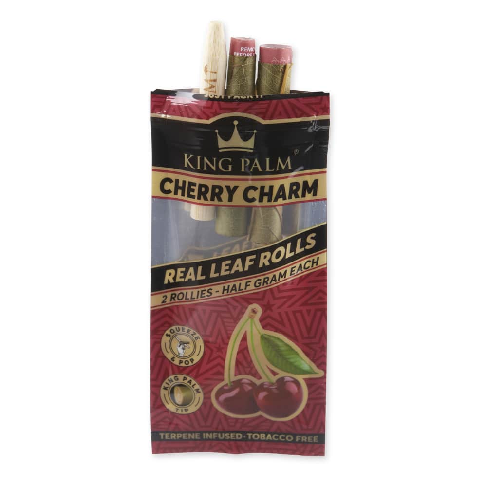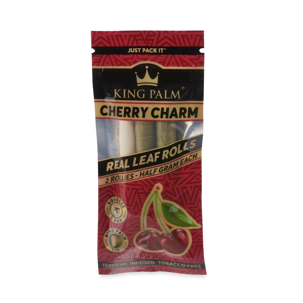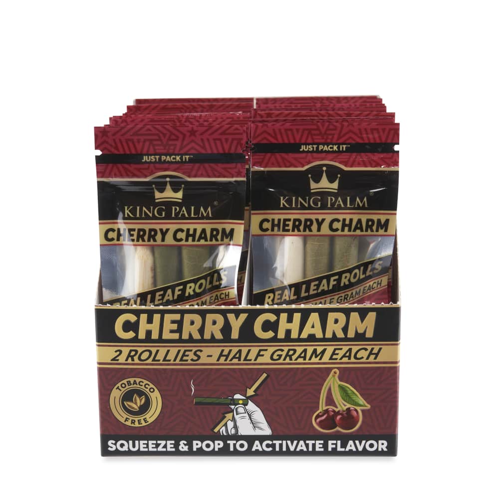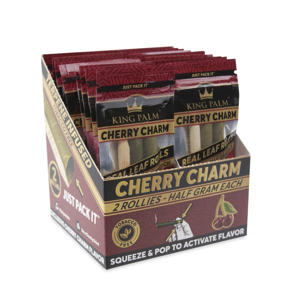 Every display comes with 20 pouches of 2 Cherry Charm Rollie Rolls. Set the display box up in your smoke shop to have your favorite flavored pre-roll cones always on hand. Simply pack the end of your King Palm, pop the filter tip whenever you’re ready, and let the lush flavors of delightful cherries blissfully transform the vibe.